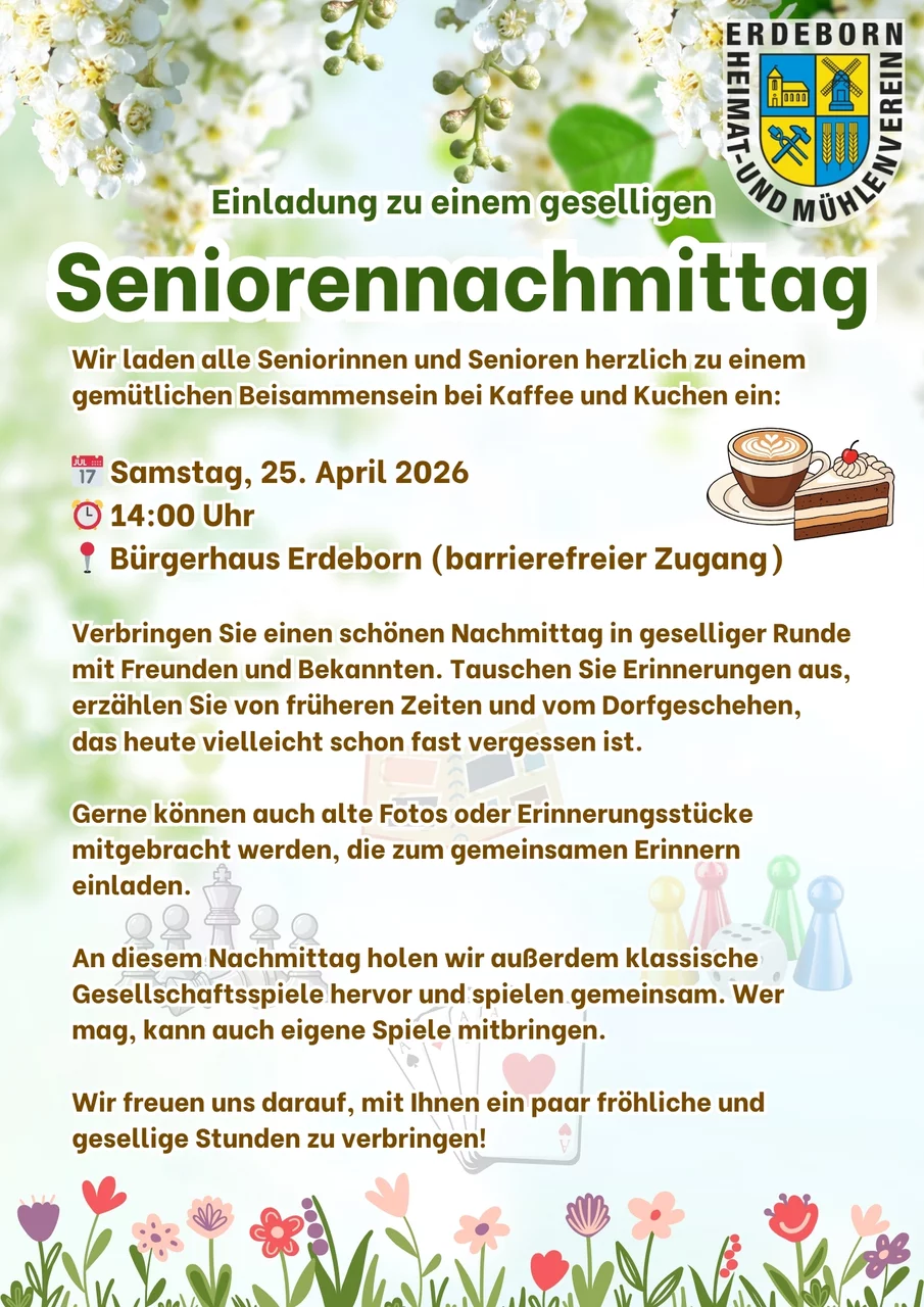 Der Heimat- und Mühlenverein Erdeborn e.V. wurde am 01. März 2023 aus insgesamt 11 Gründungsmitgliedern neu gegründet. Die Idee hierbei ist es, alle kleinen Interessensgemeinschaften in einem Verein zusammen zu bringen.